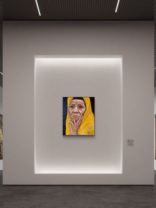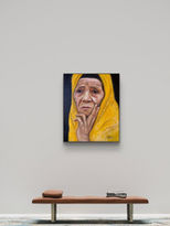 À l'huile, j'ai su saisir la chaleur de son châle jaune sur un fond neutre, symbolisant l'espoir au milieu des épreuves.